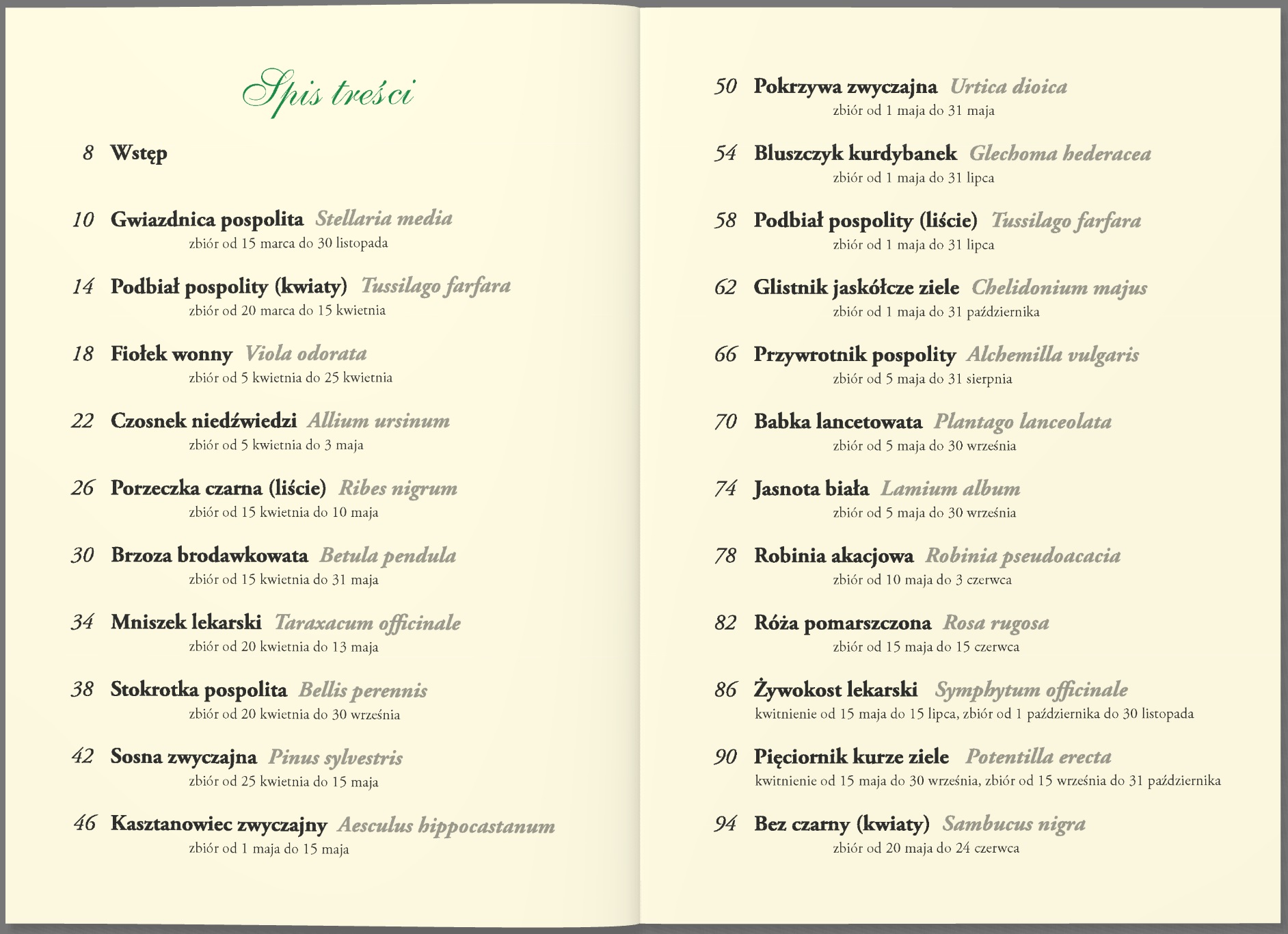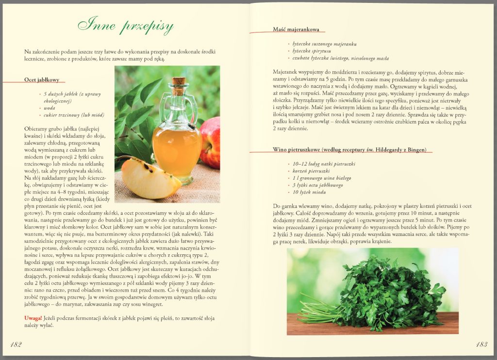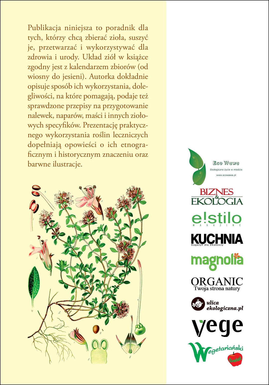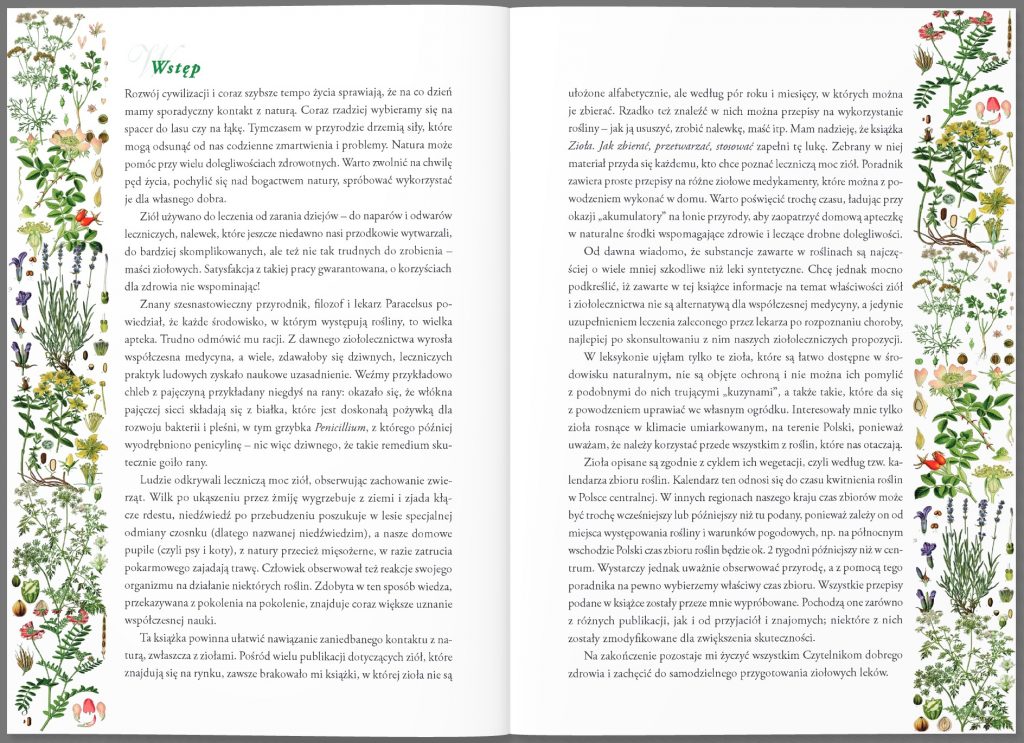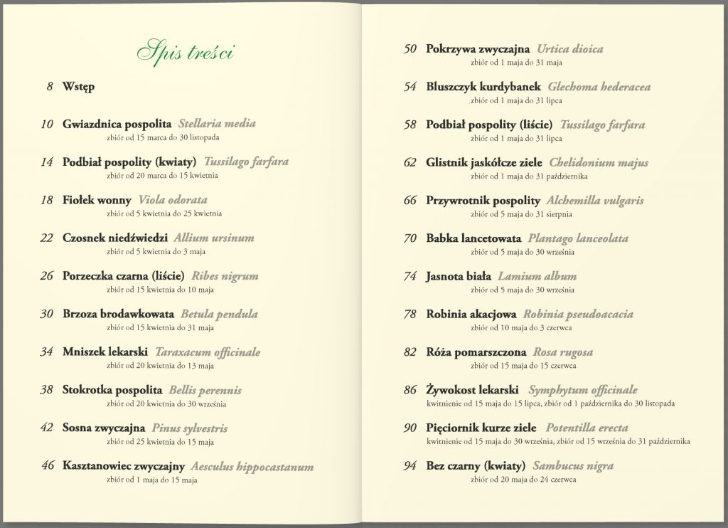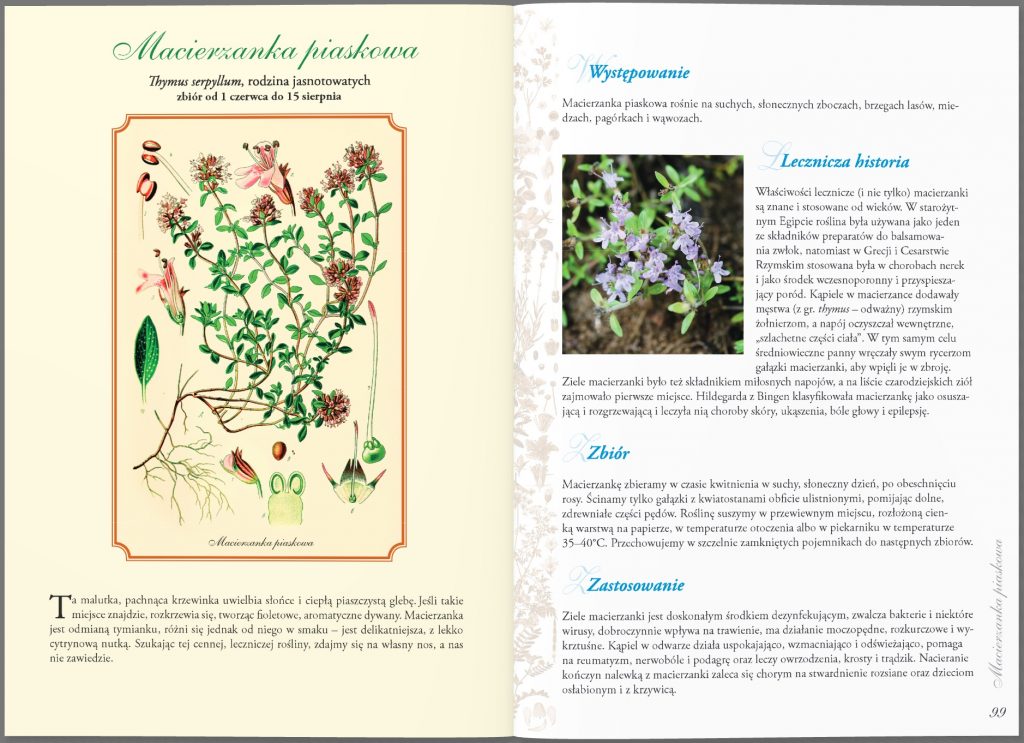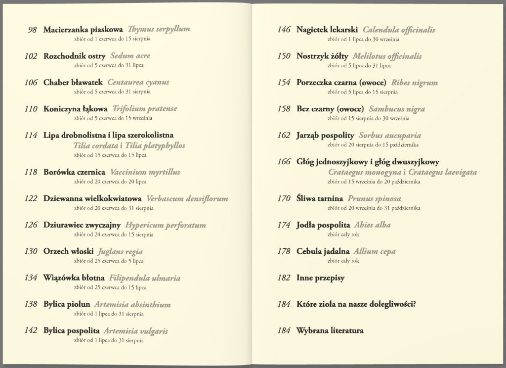 Poradnik dla tych, którzy chcą zbierać zioła, suszyć je, przetwarzać i wykorzystywać dla zdrowia i urody. Układ ziół w książce zgodny jest z kalendarzem zbiorów (od wiosny do jesieni). Autorka dokładnie opisuje sposób ich wykorzystania, dolegliwości, na które pomagają, podaje też sprawdzone przepisy na przygotowanie nalewek, naparów, maści i innych ziołowych specyfików. Prezentację roślin ubarwia opowieść o ich etnograficznym i historycznym znaczeniu.